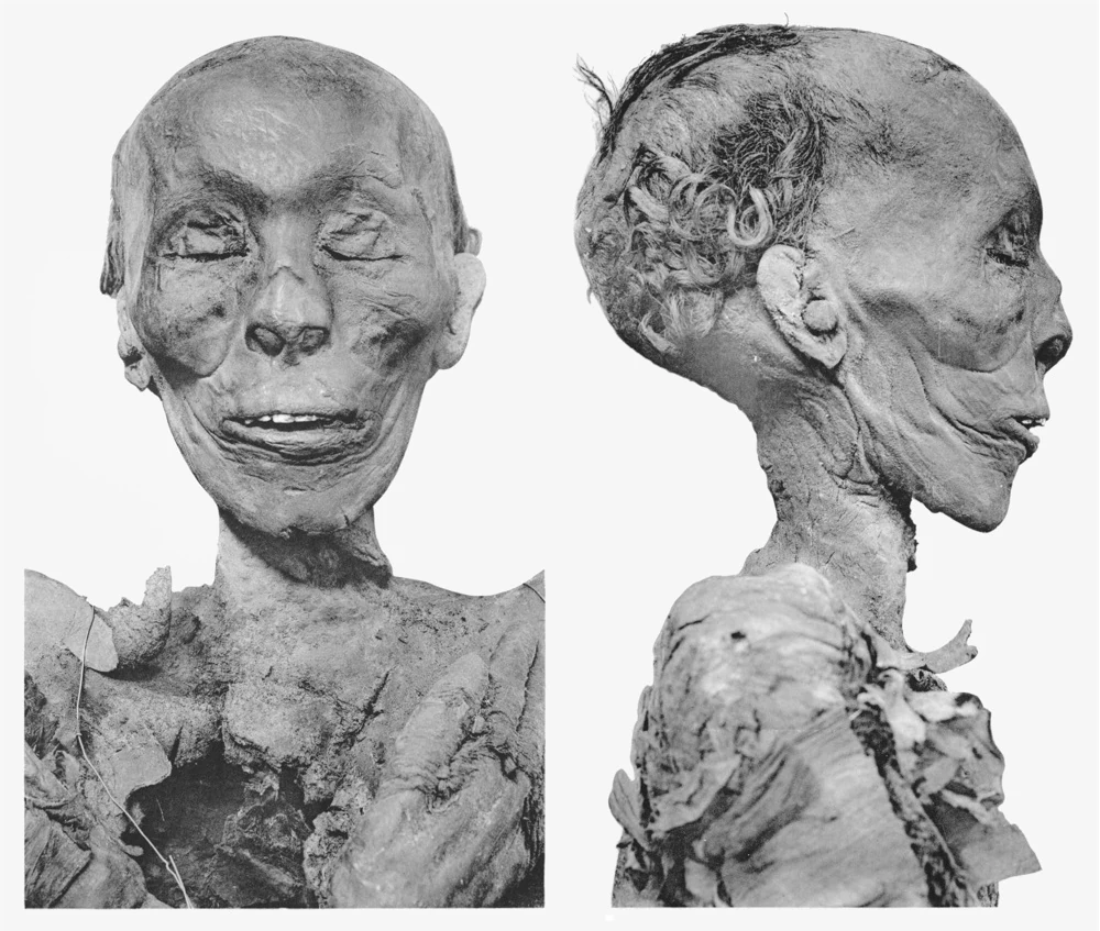- He had scarcely reached the age of thirty when he fell a victim to a disease of which the process of embalming could not remove the traces. The skin is scabrous in patches, and covered with scars, while the upper part of the skull is bald; the body is thin and somewhat shrunken, and appears to have lacked vigour and muscular power.[18]